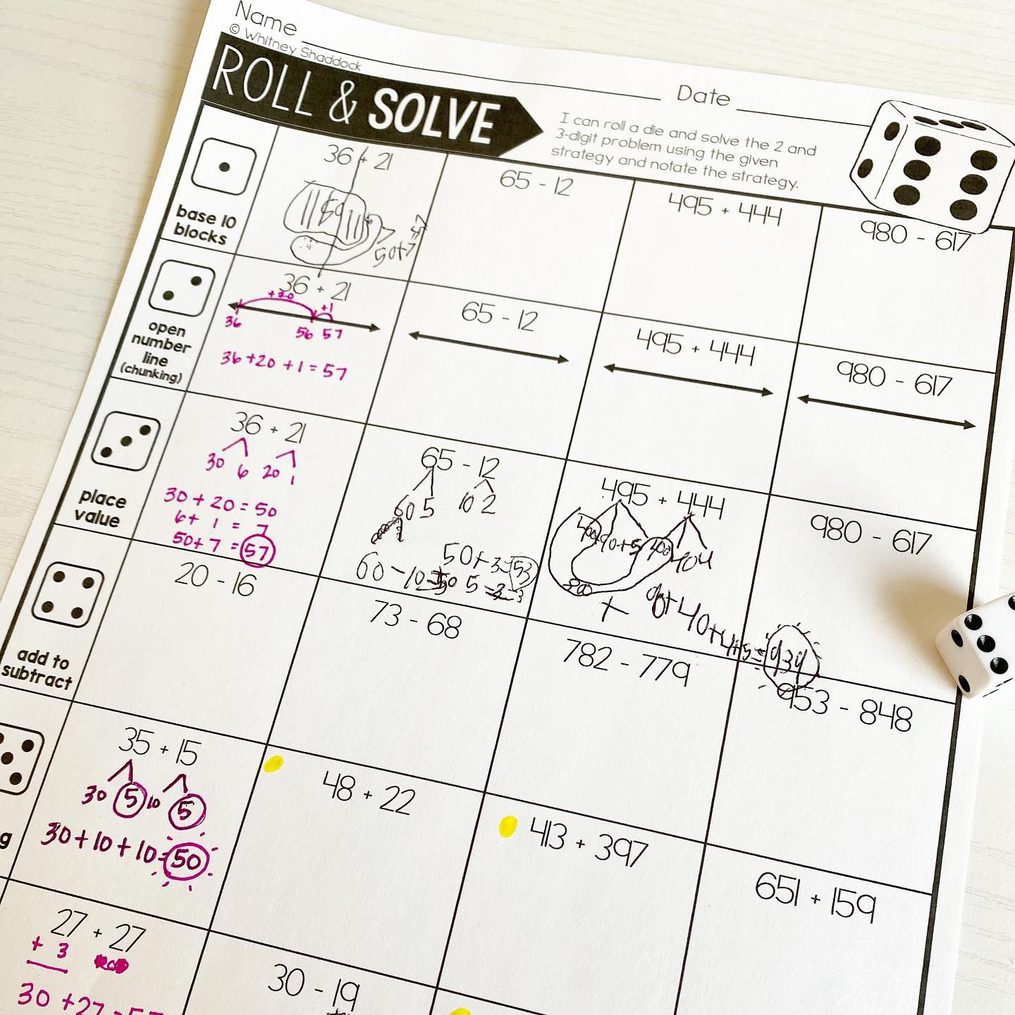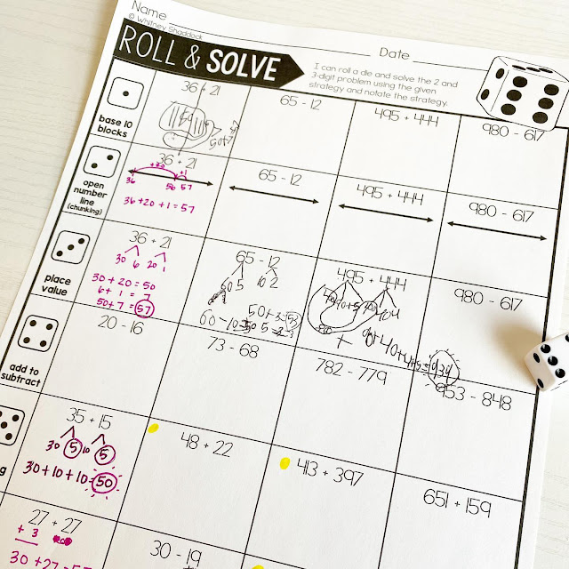 I used LOTS of Roll and _____ games in K-2. Once the kids know the framework of the game, it's easy to change out the skill across all areas of math, phonics, literacy and more! The version shown below is for practicing specific addition and subtraction strategies. It's to force kids to move away from using the same strategy every single time and push them to be more flexible mathematicians.