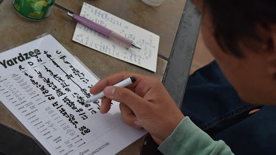 While the dads grilled, the moms and kids played a mind-stretching round of Yardzee. I was asking for some rolling guidance and my duo told me that it was about time I mastered the probability theories of mathematics. Oye.