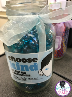 A couple times a week during lunch, the "Kindness Ambassadors" would read all the entries in the notebook and let me know how many marbles should be placed in our kindness jar (one marble for each act of kindness). At the beginning of our challenge, they also placed hearts around the room for each act of kindness, but that became overwhelming after a while!