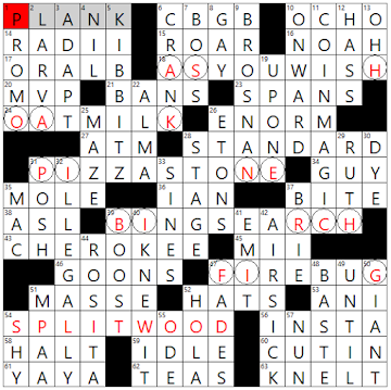 54. Do a campground chore, and a hint to the circled letters: SPLIT WOOD. They say that chopping wood warms you twice: first when you're splitting it and then when you're burning it.