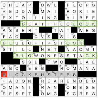 I got hung up on the crossword meaning of the word BLOCK. In a crossword puzzle, the black squares are also known as blocks. For LA Times puzzles, the maximum word count for a 15x15 is 78, and the maximum block count is 43. Today's puzzle has 76 words, and 40 blocks.